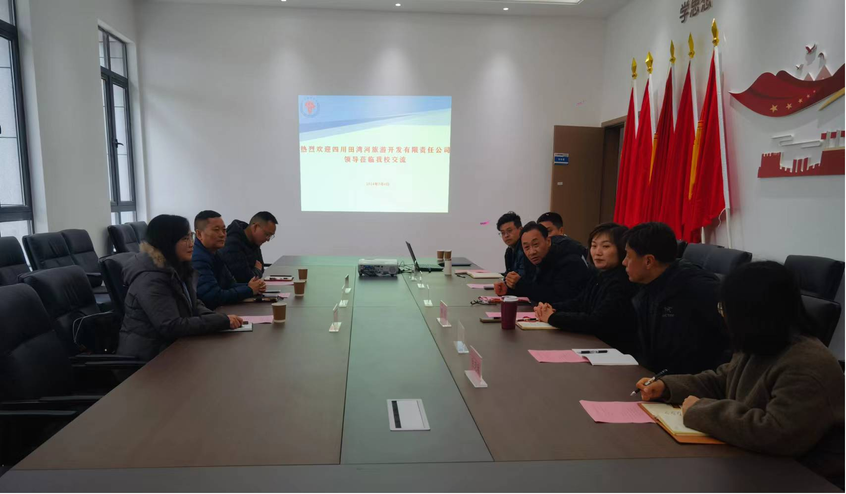 2024年3 月4日下午,四川田湾河旅游开发有限责任公司一行3人到太阳成集团tyc33455cc交流,学院院长曾洪林、党委副书记樊莉、各科室负责人参加会议。